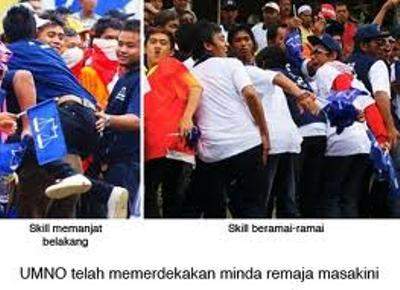 Ketiga dimana-mana saja kita boleh tonton pemuda-pemudi UMNO menunjukkan aksi lucah dengan menonggengkan bontotnya terhadap orang yang tak disukainya di khalayak ramai seperti gambar di bawah: